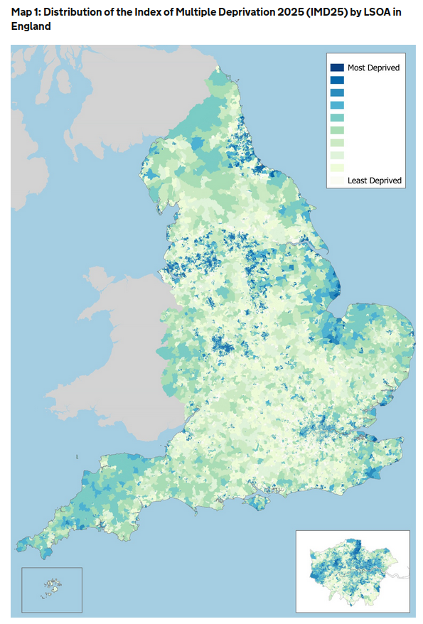 This goes just as much for the UK, where pretty much everywhere outside London is infrastructure-starved (and, as Nicholas Shaxson and John Christensen show here in their written evidence to a UK Parliamentary Committee, even where infrastructure is built outside London, the financing of it sucks money away from the area where the infrastructure is being built and towards finance centres, predominantly in London), but there is also strong resistance from all the main parties to significant redistribution via the benefit system. This results in inequalities which even the FT feels moved to comment on and a map of multiple deprivation in England which looks like this:
