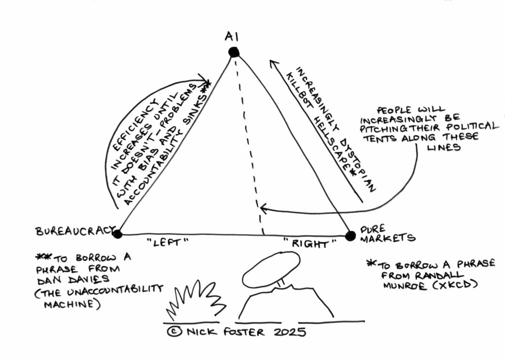 This is where we have ended up following the “slow singularity” of the Industrial Revolution I talked about in my last post. Our politics coalesced into one gymnasts’ beam, supported by the hastily constructed Late Modern English fashioned for this purpose in the 1800s, along which we have all been dancing ever since, between the market information processors at the “right” end and the bureacratic information processors at the “left” end.