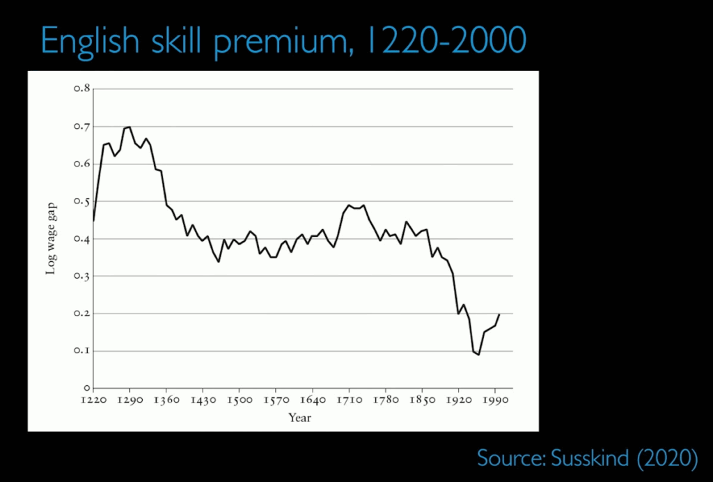 Susskind extended the usual concept of the ratio between average college and university graduate salaries to those of school leavers to include the equivalent ratio of craftsmen to labourers which then gives us data back to 1220. There are two big collapses in this ratio in the data: that following the Black Death (1346-1353), which may have killed 50% of Europe’s 14th century population, and the Industrial Revolution (which slow singularity started around 1760 and then took us through the horrors of the First World War and the Great Depression before the graph finally picks up post Bretton Woods).
