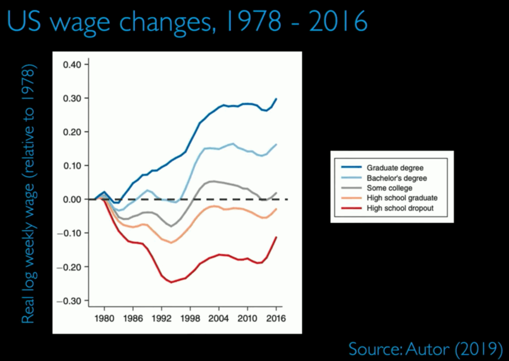 This, from 2019, introduced the idea that the picture is now more complex than high-skilled and low-skilled workers, now there is a middle. And, as Autor has set out more recently, the middle is getting squeezed: