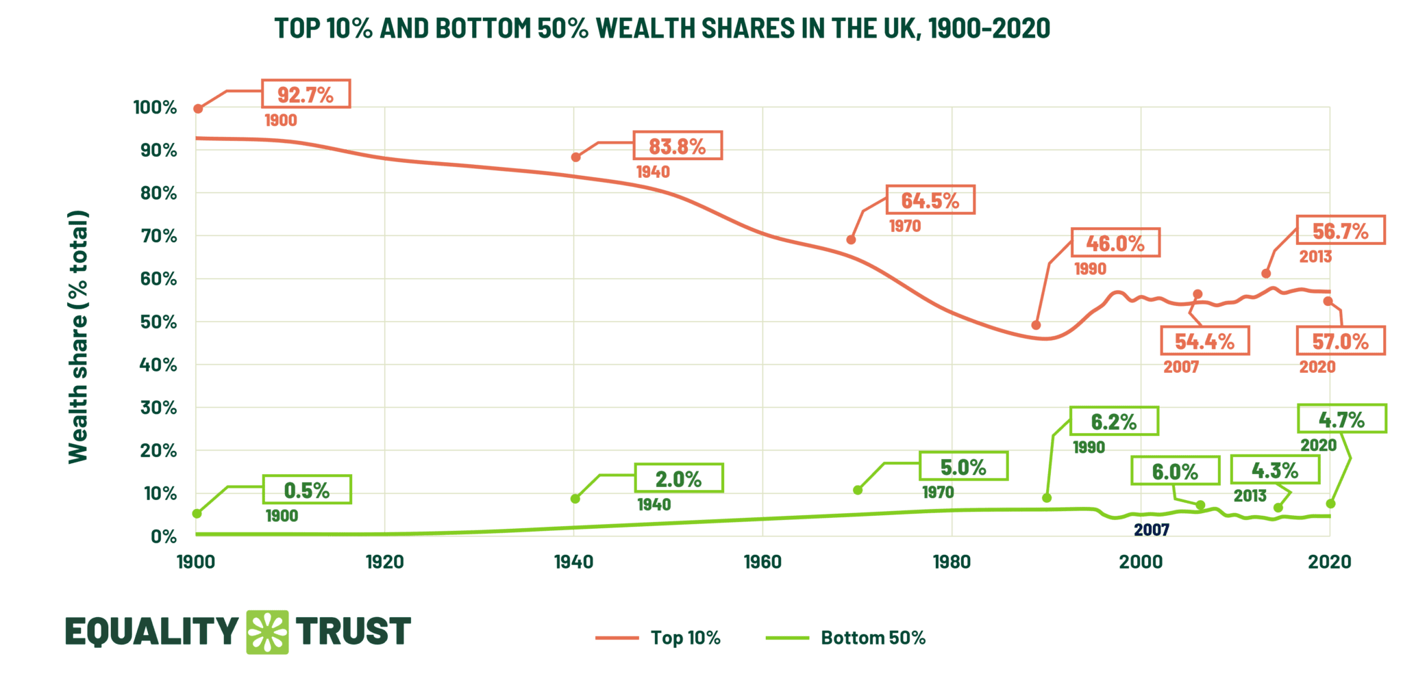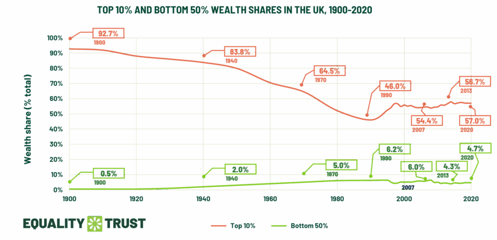 The Industrial Revolution had a distribution problem which gave birth to Chartism, Marxism, the Trades Union movement and the Labour Party in the UK alone. And all of that activity only very slowly chipped away at the wealth share of the top 10%:
