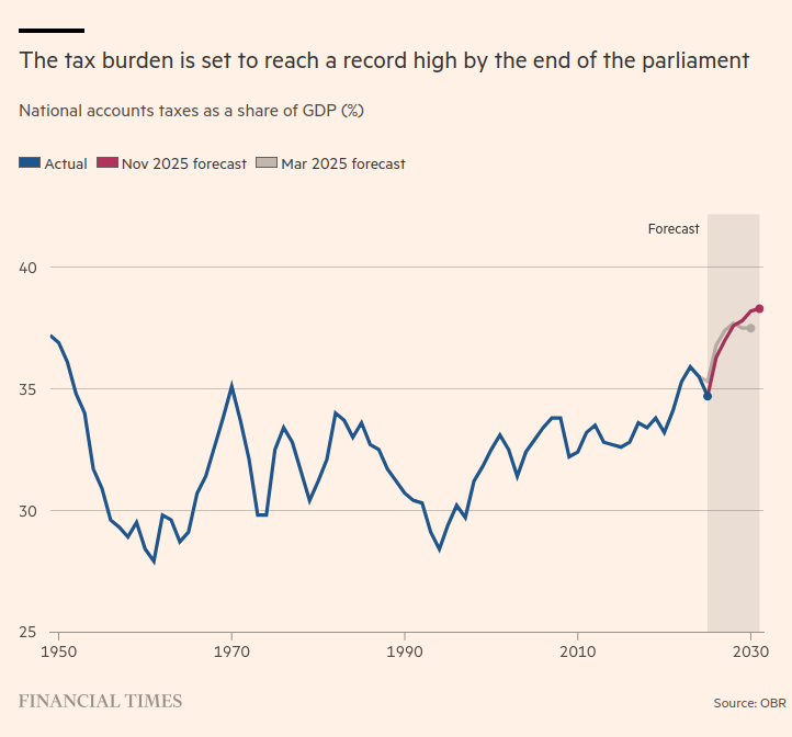 It is part of a pattern repeated yesterday, focusing on the micro when our problems are macro. Rachel Reeves increased taxes by £26 billion in yesterday’s budget, which was much less than the £40 billion in her first budget, and yet still led to the BBC reporting “Reeves chooses to tax big and spend big” and the FT leading with “Rachel Reeves’ Budget raises UK tax take to all-time high“, and with this graph: