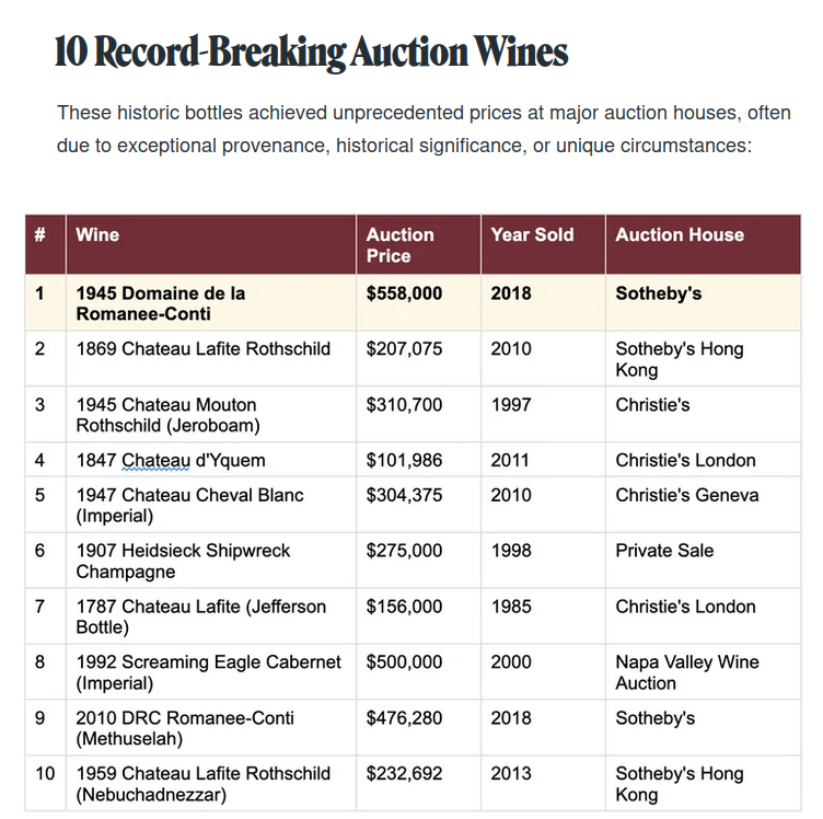 Skip forward a few decades and some of it has clearly stopped being something to drink at all, but instead a, very fragile, status asset for the very rich to demonstrate their status to each other. Here are the top prices achieved by wine at auction from one website, 8 of the 10 of them pre-dating both me and Goldfinger: