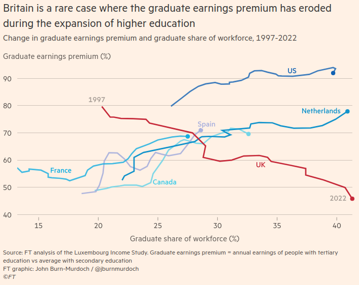 The FT article was ‘Is university still worth it?’ is the wrong question, by John Burn-Murdoch, with great graphs as usual by John. However, as is sometimes the case, I feel that a very different and more convincing story could be wrapped around the same datasets he is showing us.