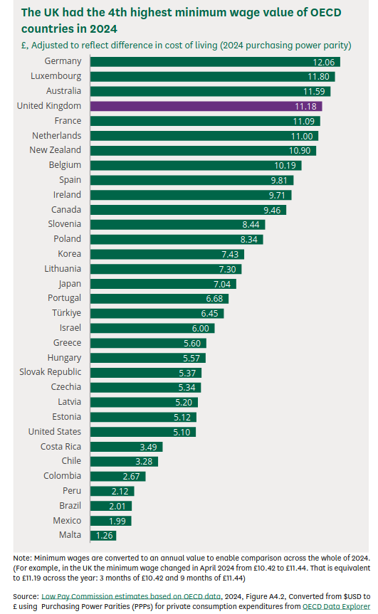 Let’s start by addressing that point about the minimum wage. According to the House of Commons Library report on this, the UK’s minimum wage is broadly comparable to that of France and the Netherlands, although higher than Canada’s and much higher than that of the United States. The employers who are the FT’s constituency would obviously like us lower down this particular chart: